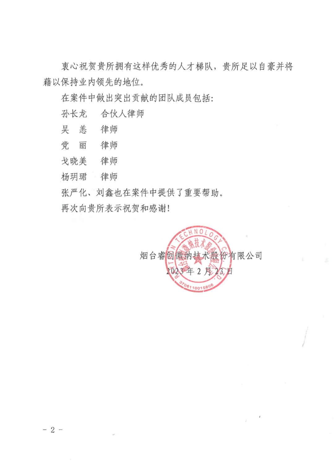 图1 睿创集团向海星体育直播寄送的表扬信