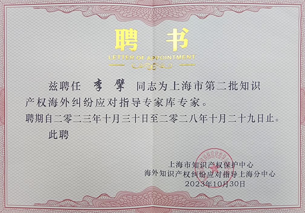 集佳上海分所合伙人骆苏华博士、合伙人李擘律师获聘成为上海市知识产权保护中心第二批海外维权援助专家(上海市第二批知识产权海外纠纷应对指导专家库专家)暨虹桥国际中央商务区海外维权援助基地首批专家。